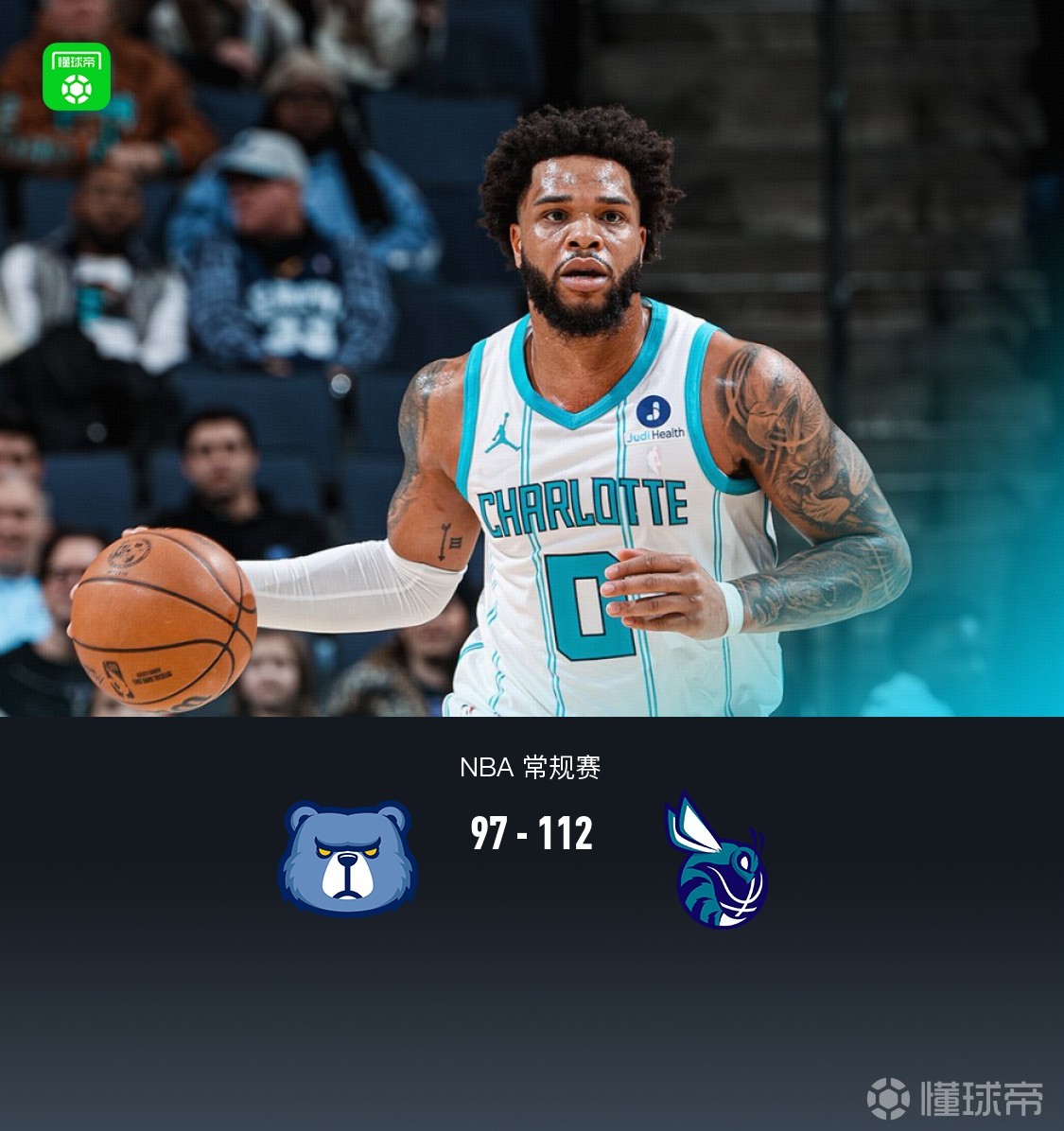 第四节灰熊文斯-威廉姆斯拿下4分,黄蜂迪亚巴特拿下12分,最终灰熊97-112不敌黄蜂