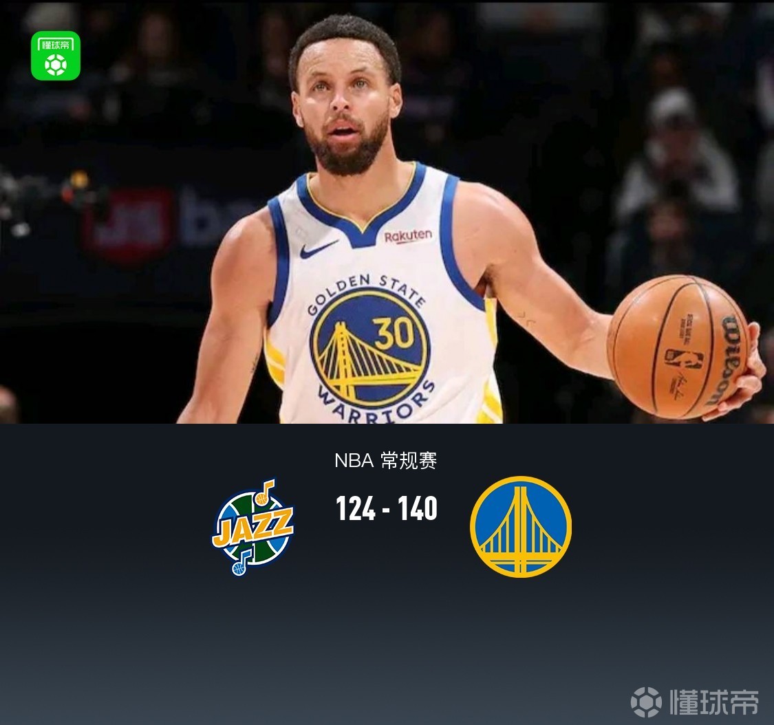 第四节,开节勇士理查德、穆迪相继三分领先14分,随后爵士科利尔、贝利相继得分再度追至个位数,勇士库里给予回应维持10分上下领先,随后勇士梅尔顿、穆迪、桑托斯领衔替补一波15-0彻底将分差拉大至27分,全场结束,勇士140-124爵士。