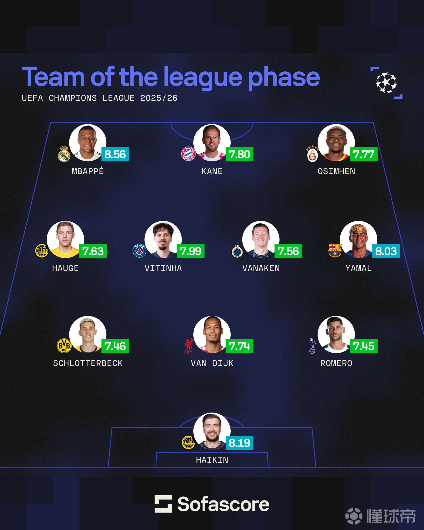 欧冠末轮最佳阵容:凯恩、姆巴佩领衔锋线,亚马尔在列