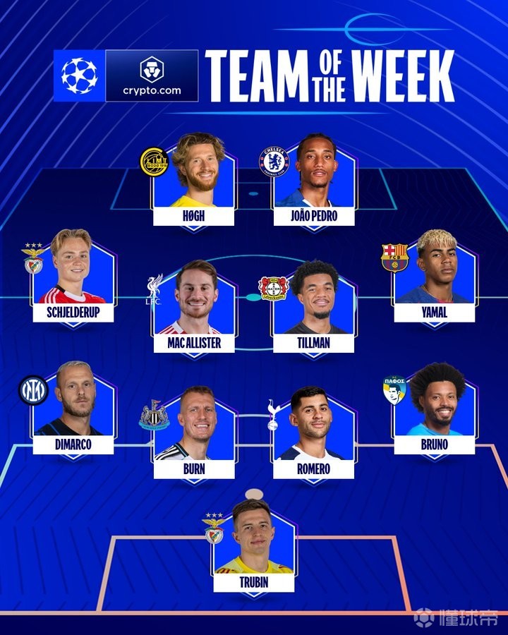 欧冠官方公布了联赛阶段第8轮的最佳阵容,战皇马破门的本菲卡门将特鲁宾入选,亚马尔在列。